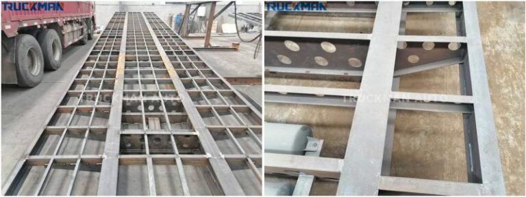 A estrutura do chassis do semirreboque de caixa plana 45FT consiste principalmente de uma viga central, viga lateral, através de vigas, e suportes de viga longitudinal. Todas estas peças são feitas de uma placa de manganês Q355 com uma forte capacidade de carga e estrutura estável. Todos os aspectos são jato de areia para melhorar a aderência da tinta. A soldadura automática por arco submerso é adoptada para garantir a qualidade da soldadura.